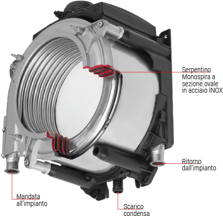 Scambiatore monotermico realizzato con un involucro in acciaio che permette di contenere il calore e un convogliatore in materiale composito che permette di ricevere e drenare la condensa.